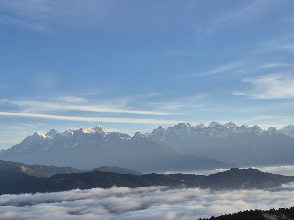 Dagen etter sto vi opp før soloppgang og kjørte lenger nord. Vi skulle enda høyere opp for å få med oss soloppgangen over Himalayafjellene og for å se Mount Everest. Turen opp var mørk, og bilen ristet like mye som på vei til Okhaldunga. Etter en times kjøretur begynte det å lysne. Vi gikk opp til en topp som lå 3000 meter over havet. Klokken var blitt 07.00, og vi fikk en fantastisk utsikt over fjellene. Etterpå spiste vi pannekaker og drakk kaffe og te på en lokal restaurant.