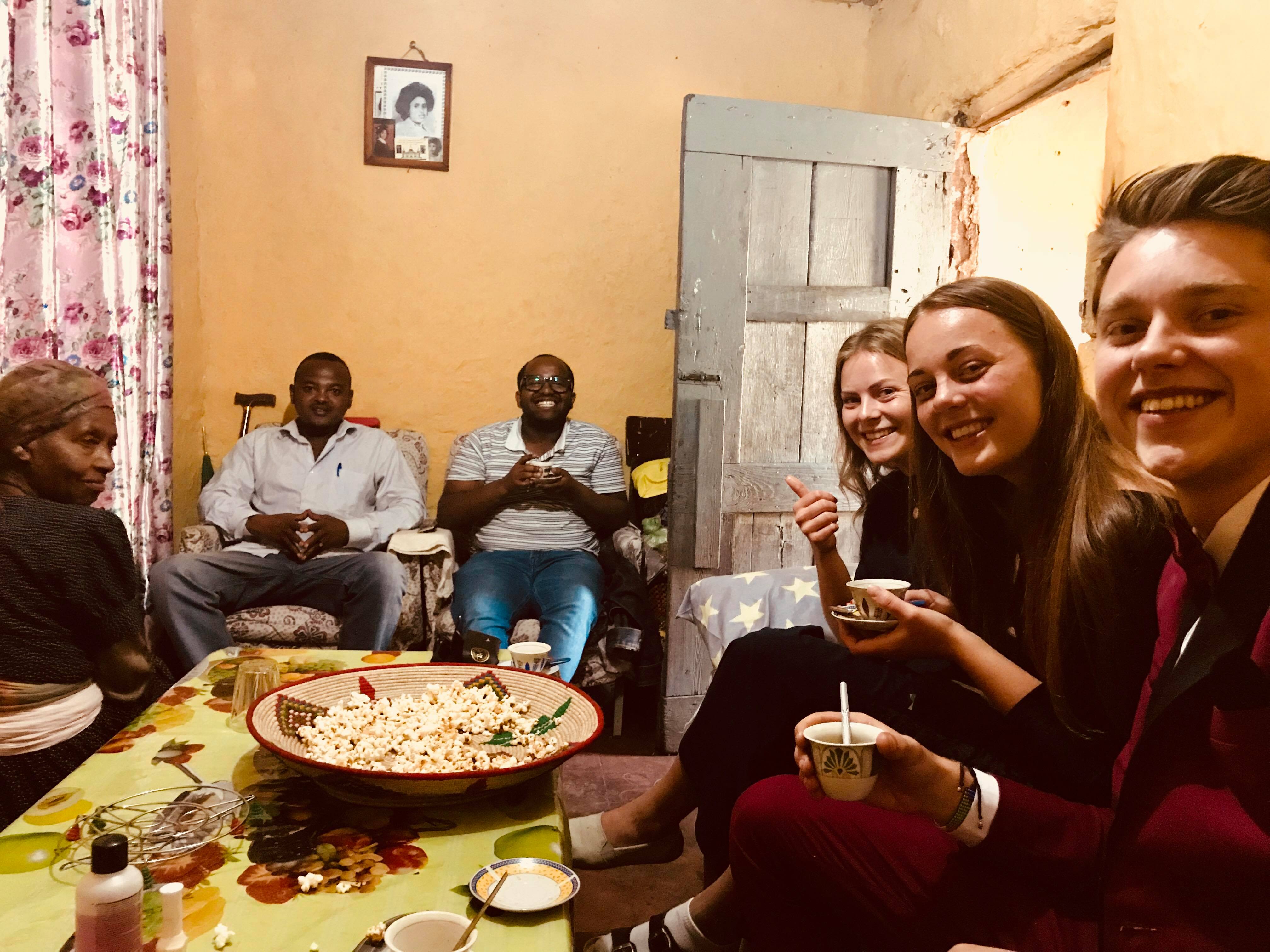Å forsøke å lage en typisk norsk jul i Etiopia ville vært et mislykket forsøk. Vi var derfor alle innstilte på å ha litt andre forventinger til julen i år. Vi startet juledagen på meget tradisjonell, norsk vis ved å se deler av (ser noen i det hele tatt hele?) Askepott, med frokost bestående av bremykt og salami, som vi har spart på siden vi kom hit. Etterpå dro vi på gudstjeneste på NLM-tomta. Der møtte vi mange nordmenn og vi sang gode, gamle, norske julesanger. Dette etterfulgt av et lite besøk hos en i nabolaget. Vi ble servert ekte etiopisk kaffe og sukret popcorn. Nei, ikke det typiske julebesøket akkurat.